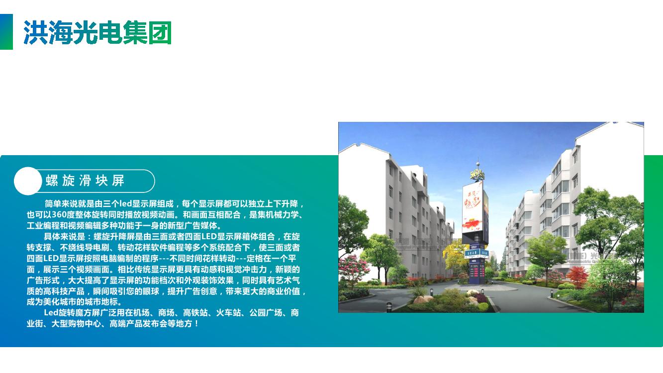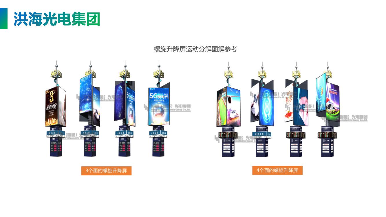 具體來說是:螺旋升降屏是由三面或者四面LED顯示屏箱體組合,在旋轉(zhuǎn)支撐、不繞線導(dǎo)電刷、轉(zhuǎn)動(dòng)花樣軟件編程等多個(gè)系統(tǒng)配合下,使三面或者四面LED顯示屏按照電腦編制的程序---不同時(shí)間花樣轉(zhuǎn)動(dòng)---定格在一個(gè)平面,展示三個(gè)視頻畫面。相比傳統(tǒng)顯示屏更具有動(dòng)感和視覺沖擊力,新穎的廣告形式,大大提高了顯示屏的功能檔次和外觀裝飾效果,同時(shí)具有藝術(shù)氣質(zhì)的高科技產(chǎn)品,瞬間吸引您的眼球,提升廣告創(chuàng)意,帶來更大的商業(yè)價(jià)值,成為美化城市的城市地標(biāo)。Led旋轉(zhuǎn)魔方屏廣泛用在機(jī)場(chǎng)、商場(chǎng)、高鐵站、火車站、公園廣場(chǎng)、商業(yè)街、大型購(gòu)物中心、高端產(chǎn)品發(fā)布會(huì)等地方。